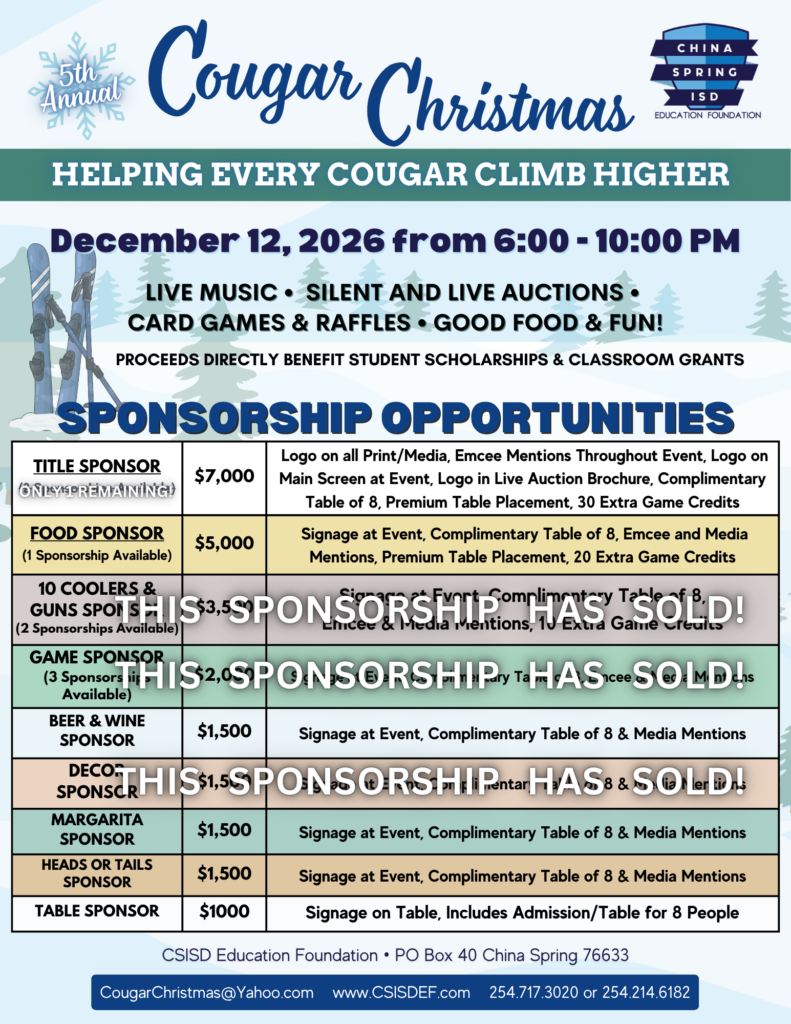 We are incredibly excited for our 5th Annual Cougar Christmas event on Saturday, December 12th, 2026. We have an exciting NEW LOCATION, and an even BIGGER & BETTER event planned for you! Join us as we raise funds for Student Scholarships & Classroom Grants that directly benefit all students in China Spring ISD!